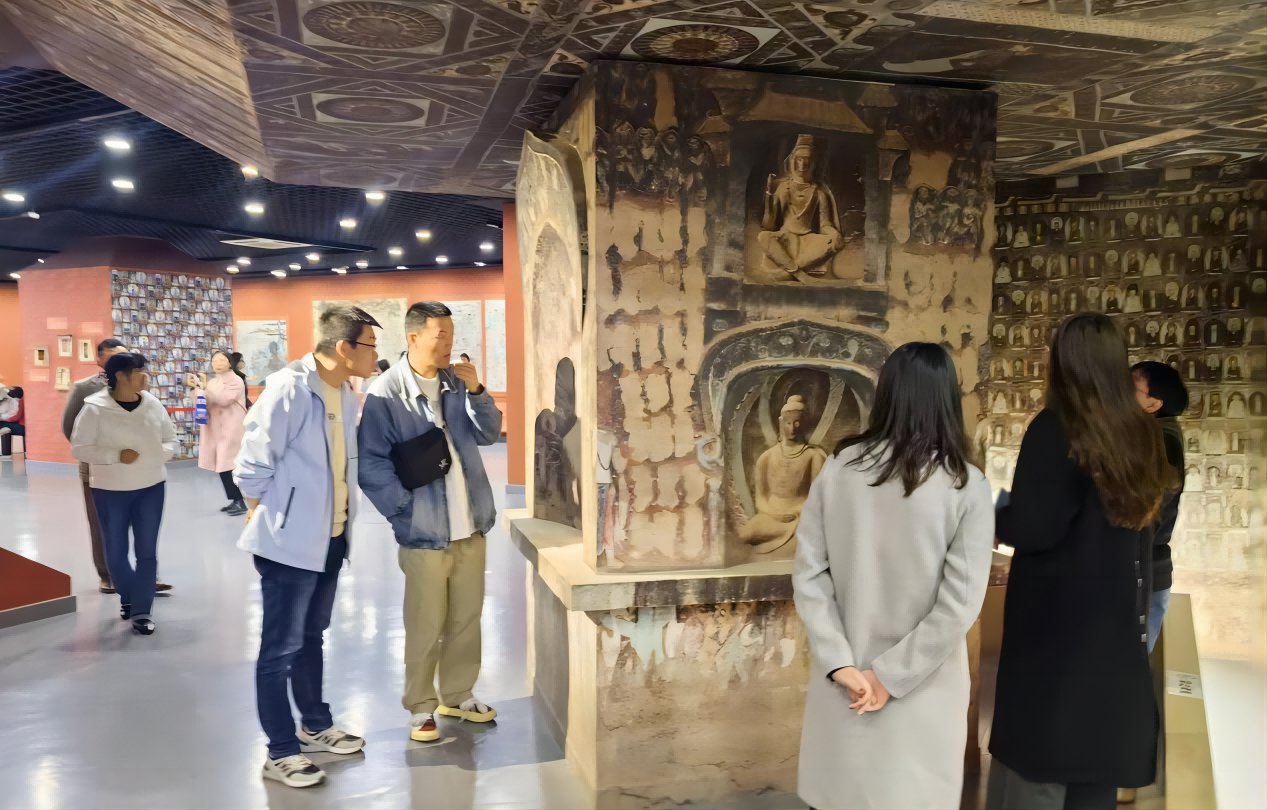 2023年10月23日,我公司組織員工在敦煌研究院蘭州分院敦煌藝術館內(nèi)參觀“覺色敦煌 莫高精神”敦煌石窟藝術展。走進敦煌藝術館,無論是抬頭可見的藻井天花板,抑或是墻角邊印著莫高窟窟區(qū)的全景照片,每一處細節(jié)都被濃厚的敦煌元素所覆蓋。在這里我們可以不受外界打擾,在感興趣的壁畫前安靜地、耐心地去觀賞每一處細節(jié)。